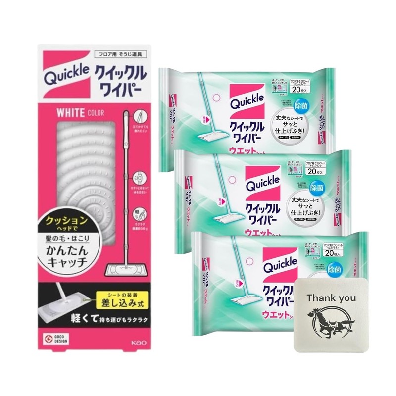 Kao Quickle Wiper Floor Cleaning Tool, 1 Main Unit + 20 Wet Sheets, Set of 3 + Kunutonn Original Logo e-Bonus