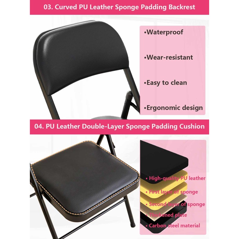 - 【PU Leather Sponge Padded Cushions Backrest And Seat 】These Padded folding chairs are made of wear-resistant and waterproof PU leather sponge cushioned seats and backs, which are very comfortable and easy to clean, making them perfect for long-term use, whether you are hosting a party or setting up a temporary office space.