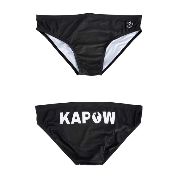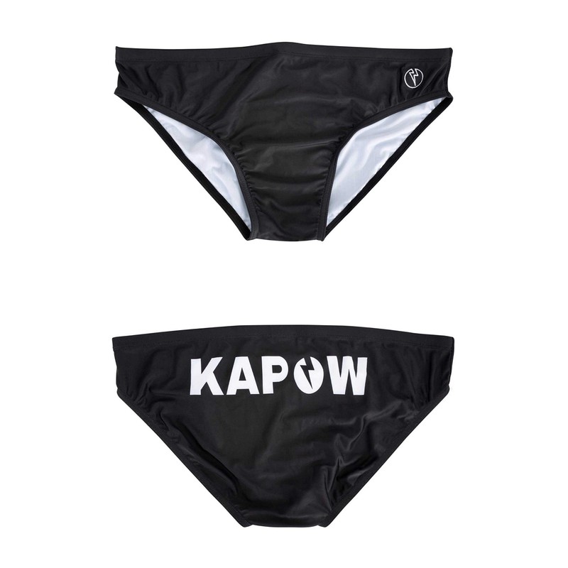 - Sable Swim Brief: black swim trunks with oversized logo. The tuxedo of the swimming pool. Kapow's signature swim briefs combine an all-black design with an oversized logo on the back. They take you from the sea to the swim-up bar in incomparable style