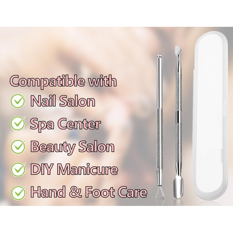- Contents: you will receive a set with a steel pusher and a nail removal slicer to perform various manicure work. With the steel slider, you can slide over grooves, trim the nail edges and remove the cuticles. The nail removal planer can be used to remove nail polish, embellishments and residue from the nails. This set offers a comprehensive range of manicure tools for all your nail art needs.