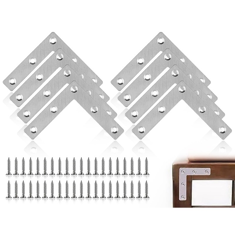 KAPSING Pack of 8 Flat Angle, 90 Degree L Flat Corner Bracket, Stainless Steel Corner Bracket, Flat Connector, for Wooden Furniture, Cabinets, Tables and Chairs