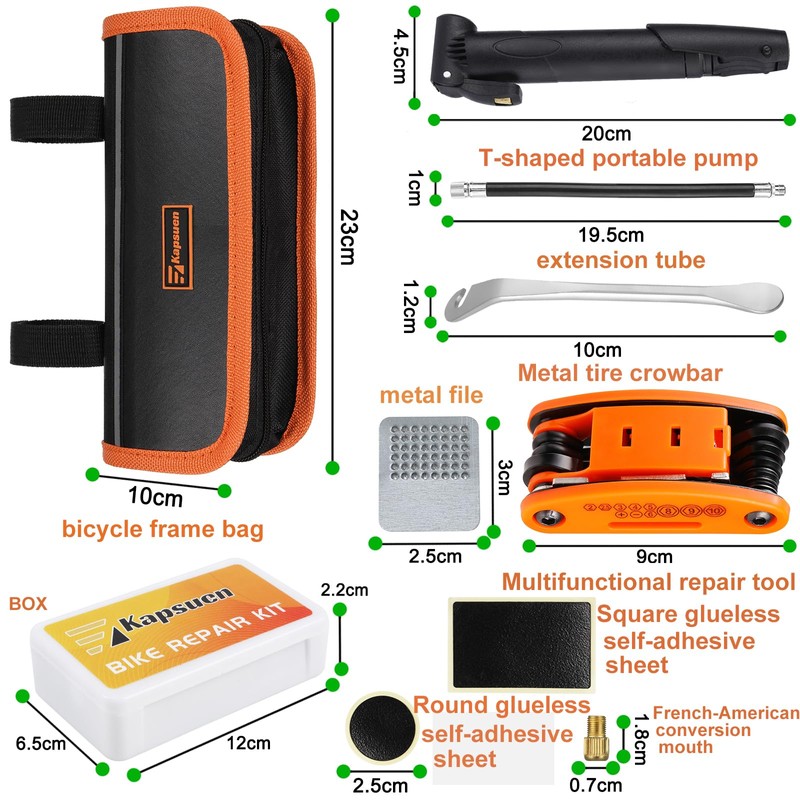 - 【Bike Tool Kit】1 Black Storage Bag (16-In-1 Bicycle Multi-Tool Set, 2 Tire Crowbars , 1 Allen Wrench, 1 Mini Pump, 1 Inflation Extension Tube), 1 Mini Tire Repair Box (10 Tire Patches, 2 Metal Tire Files, 1 valve core) .This Bike Accessories You Can Solve Most of Your Bike'S Problems.