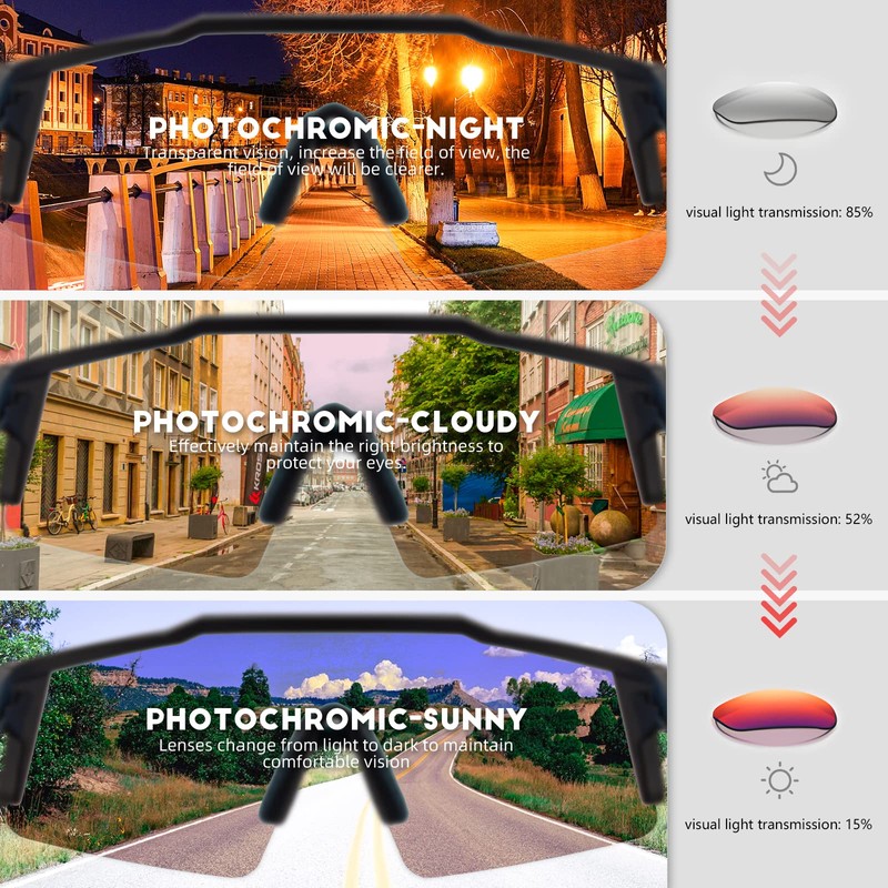 - 【Photochromatisch Fahrradbrille】These Radfahren Brille nehmen photochrome Technologie, Objektiv automatisch klarer oder verdunkelt als Reaktion auf die Intensität der ultravioletten, Wechsel von klar zu dunkel in sonnigen, effektiv eine geeignete Helligkeit, um Ihre Augen zu schützen.Die Dunkelheit der Linsenfarbe hängt von der UV-Intensität ab