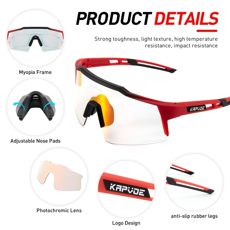 KAPVOE Photochromatische Selbsttönend Fahrradbrille TR90 Rahmen für Herren Damen Klar Sportsonnenbrille Sport Radfahren MTB Radbrille Fahren Sportbrille Baseball Laufen Rot 05