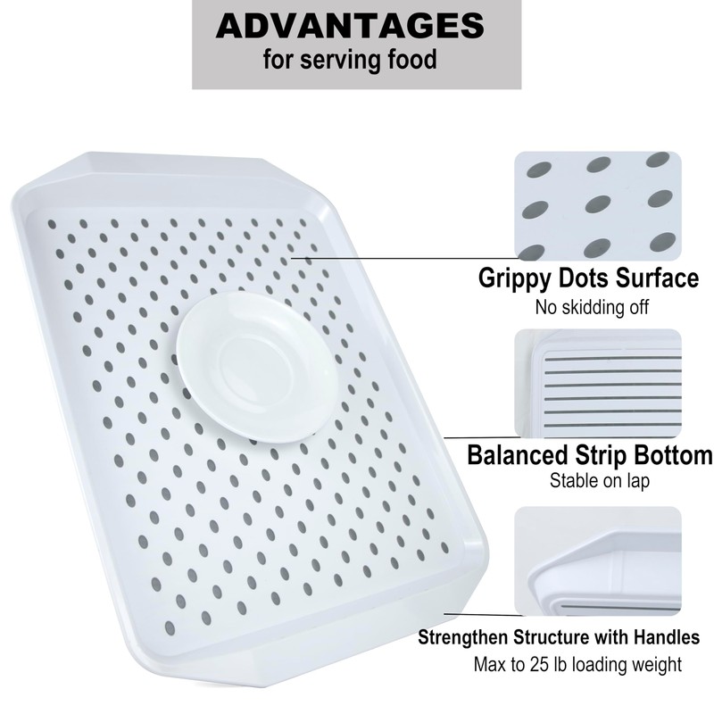 - STURDY ANTISLIP SERVING TRAYS: The Grippy nubs on the surface are ideal for carrying your plates and dishes without sliding off, and the bottom has balanced stripes, which can ensure trays stay on the table or lap without slipping and won't scratch the table