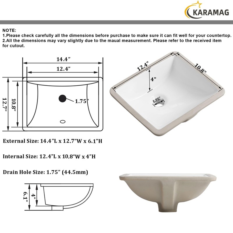 • Dimension: 14 Inch (14.4"x12.7") under counter bathroom sink. (External: 14.4x12.7x6.1 Inch; Internal: 12.4x10.8x4.0 Inch) US standard 1.75”drain opening, please notice that: faucet and sink drains are not included in the package