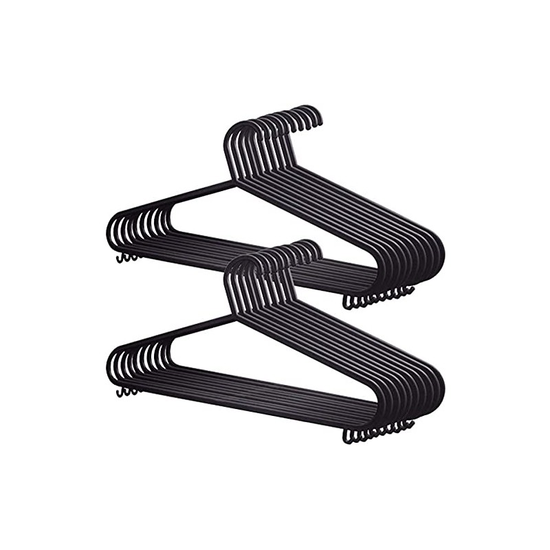 - Adult black coat hanger with trouser bar and lips for hanging lighter clothes and garments such as Tshirts, shirts, blouses, suit, coat, sweaters, dresses, short pants, skirts etc.
