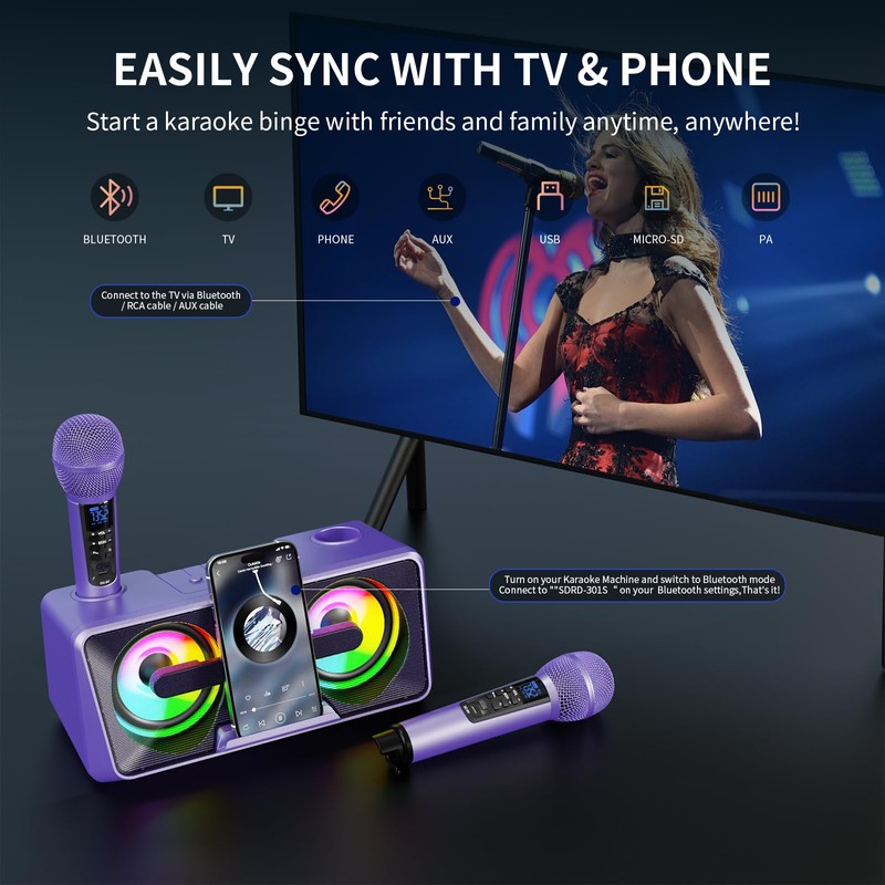- 【Multiple Connectivity &Bluetooth 5.0】Your favorite hits can become karaoke songs on this amazing Bluetooth karaoke speaker! Karaoke machines have easy connectivity via Bluetooth 5.0/USB Port/MicroSD Card by many external devices like iPhones, Android mobile phones, iPads, TVs, PC, etc. The AUX cable can be used to connect to the TV and sync lyrics, allowing you to enjoy the ultimate home karaoke machine.