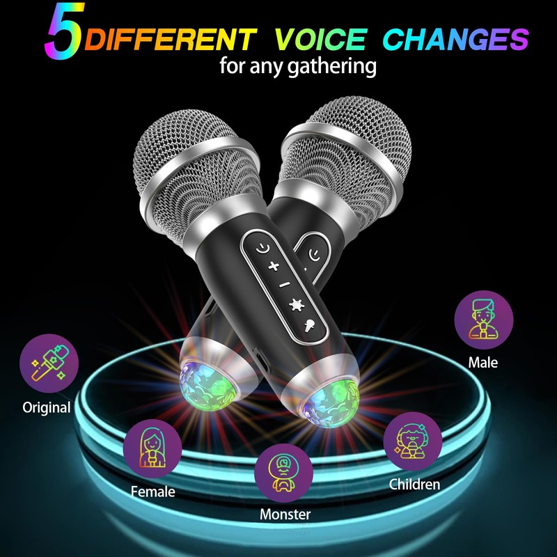 - Funny Voice Change: The karaoke microphones feature 5 magic voices (monster, children, female, male, and original voice), providing endless fun for adults and kids alike. Long-press the voice button to switch between different sound effects; short-press to toggle the original sound on/off.