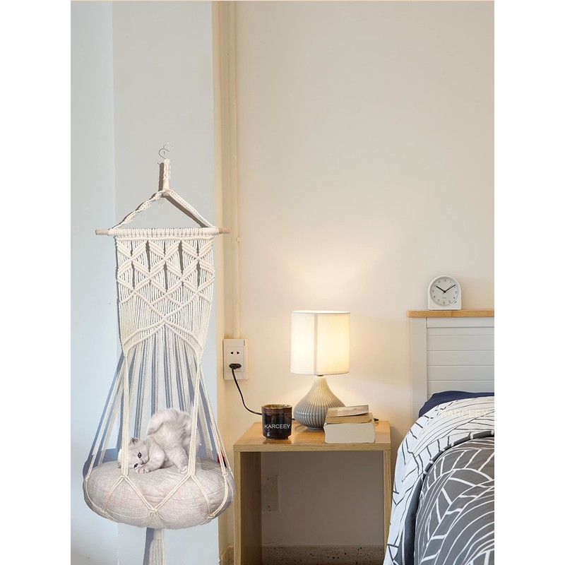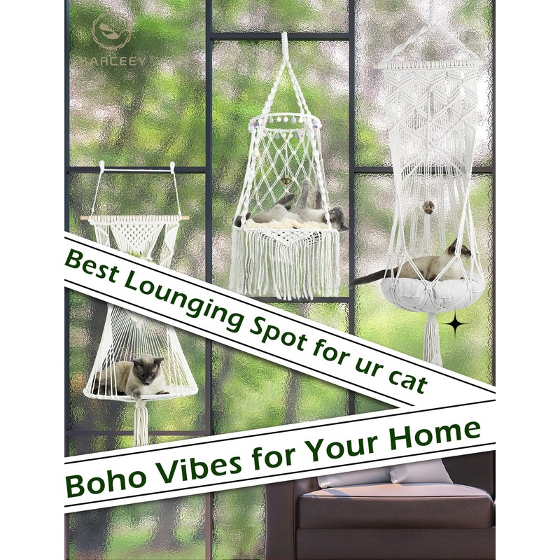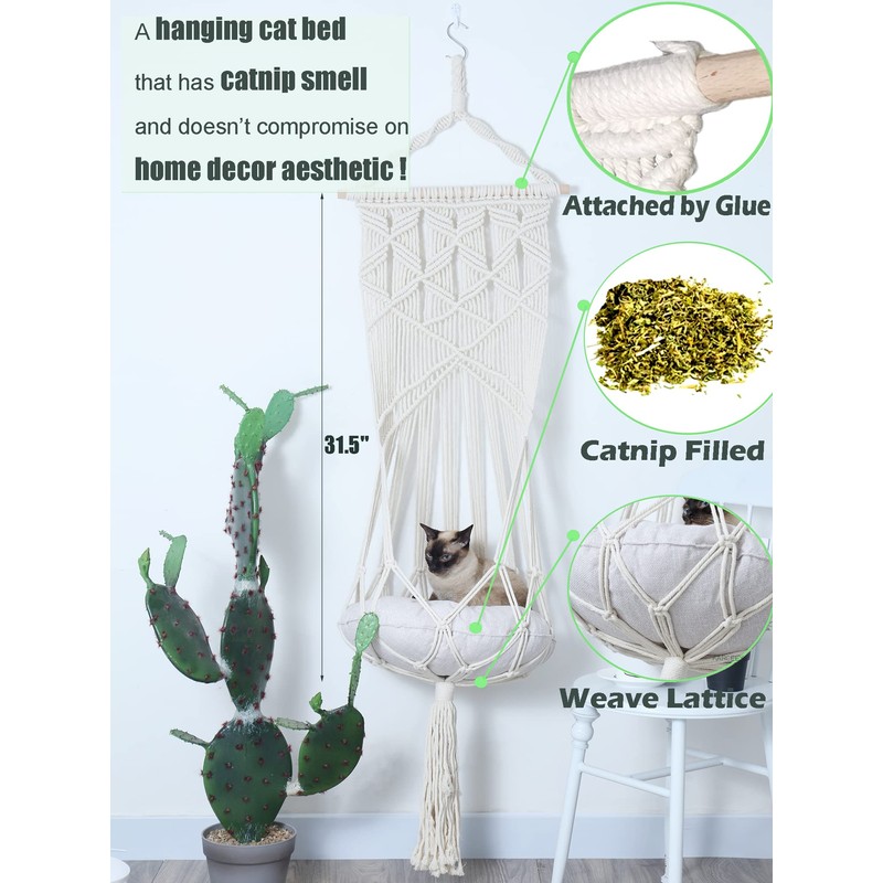 - KARCEEY macrame hanging cat bed with catnip filled are a seamless addition to any room’s décor!Thanks to its round shape bed, It is ideal for pets who love to curl up! This macrame lounger is leaving your cat in an island mindset.