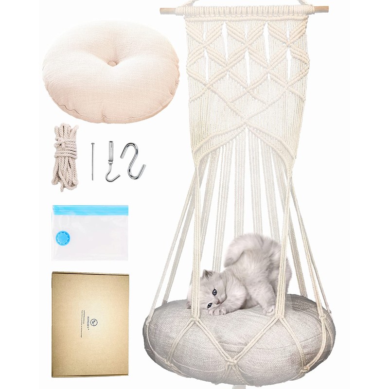 KARCEEY Macrame Cat Hammock,Macrame Hanging Cat Bed with Catnip Cushion and Hanging Kit (1.Macrame Hammock with Cat Bed)