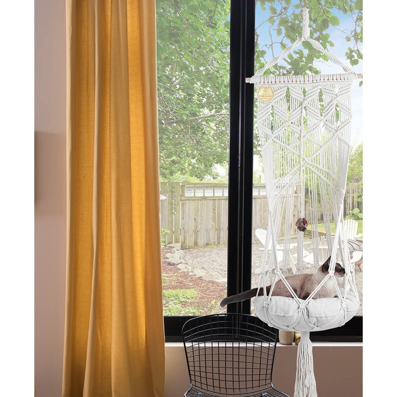 - Macrame cat swing made of handwoven heavy-duty cotton rope and 2cm-dia hard solid beech wood stick, Very safe and sturdy. Finished with braided an "O" ring loops at top of the hammock for hanging, it's the perfect addition to your living room or patio.