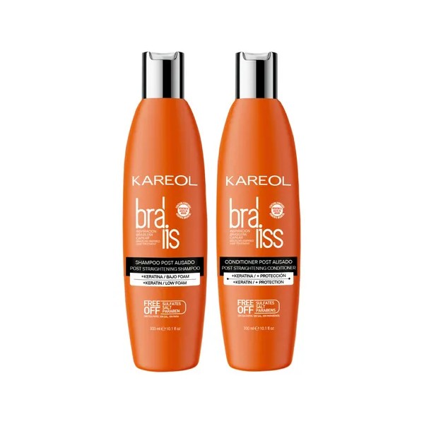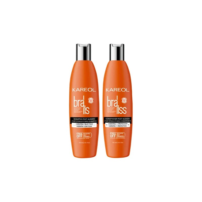 - Kareol Braliss Post Alisado Shampoo y Acondicionador · Keratina · Prolonga la vida del alisado Kareol es una línea de productos capilares especialmente formulados con ingredientes naturales y amigables con el medio ambiente. Nuestros productos NO CONTIENEN SAL, SULFATOS, DEA y PARABENOS. Con activos obtenidos con las más avanzadas tecnologías para ofrecerte una amplia gama de beneficios como suavidad, brillo, nutrición, fuerza, hidratación y poder antioxidante · Tu cabello liso por más tiempo, un shampoo sin sal · Enriquecido con keratina, oro líquido y polímeros reparadores capilares · Limpia, humecta y promueve la recuperación capilar · Totalmente libre de Parabenos, Sal, Sulfatos y DEA · Ingredientes naturales y amigables con el medio ambiente · Libre de maltrato animal Tipo de Cabello: Liso, deshidratado, reseco, con frizz Libre de Sulfatos, Sal y Parabenos. Formulado con tecnología KERALISS, que es el complejo formulado con Keratina de Alta afinidad capilar, Oro líquido y polímeros reparadores capilares, que ayudan a prolongar el efecto liso de Braliss Máscara Alisadora por más tiempo. Nuestro Shampoo y Acondicionador Post Alisado especializado, limpia, humecta y promueve la recuperación capilar prolongando el efecto liso del cabello. Contenido: · 1 Shampoo 300 ml · 1 Acondicionador 300ml Ingredientes Shampoo: Water, Disodium Laureth Sulfosuccinate, Cocamidopropyl Betaine, Cocamide Mipa, Decyl Glucoside, Propylene Glycol, Argania Spinosa Kernel Oil, Hydrolyzed Keratin, Chitosan Succinamide, Disodium EDTA, Polyquaternium