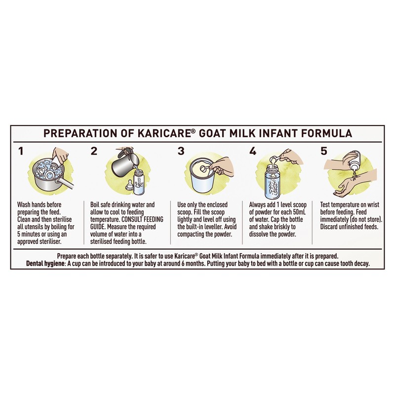 1. Wash hands before preparing the feed. Clean and then sterilise all utensils by boiling for 5 minutes or using an approved steriliser. 2. Boil safe drinking water and allow to cool to feeding temperature. CONSULT FEEDING GUIDE. Measure the required volume of water into a sterilised feeding bottle. 3. Use only the enclosed scoop. Fill the scoop lightly and level off using the built-in leveller. Avoid compacting the powder. 4. Always add 1 level scoop of powder for each 50mL of water. Cap the bottle and shake briskly to dissolve the powder. 5. Test temperature on wrist before feeding. Feed immediately (do not store). Discard unfinished feeds. Prepare each bottle separately. It is safer to use Karicare Goat Milk Infant Formula immediately after it is prepared.