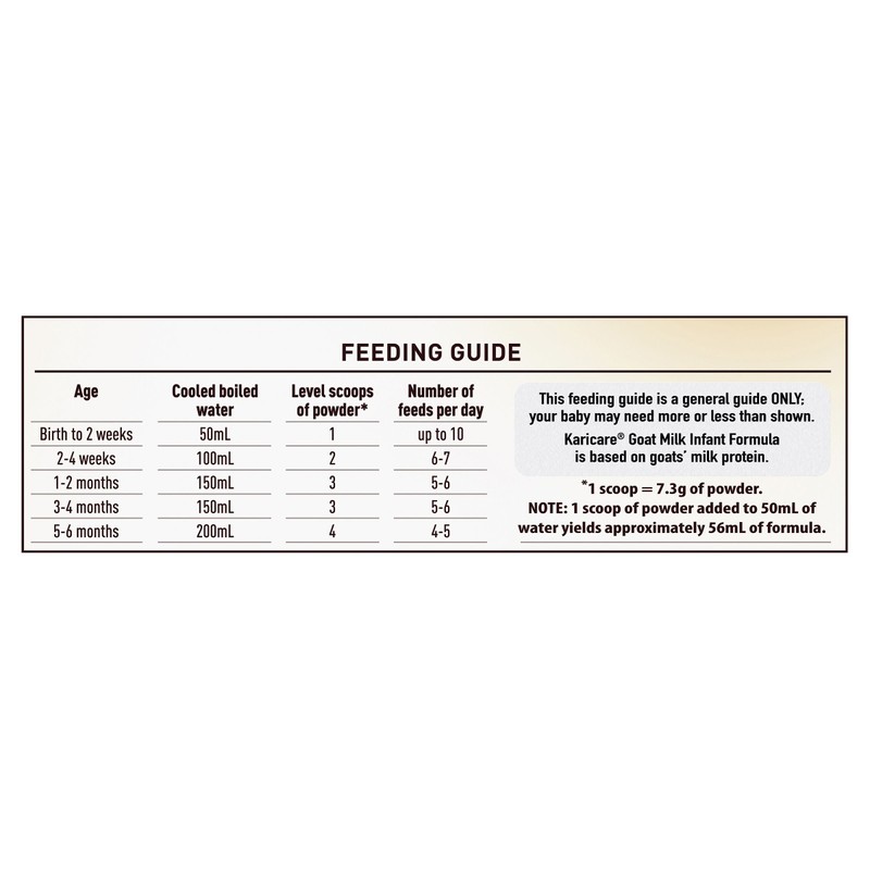 Feeding Guide - Age: Birth to 2 weeks, Cooled boiled water: 50mL, Level scoops of powder*: 1, Number of feeds per day: up to 10. Age: 2-4 weeks, Cooled boiled water: 100mL, Level scoops of powder*: 2, Number of feeds per day: 6-7. Age: 1-2 months, Cooled boiled water: 150ml, Level scoops of powder*: 3, Number of feeds per day: 5-6. Age: 3 - 4 months, Cooled boiled water: 150mL, Level scoops of powder*: 3, Number of feeds per day: 5-6. Age: 5 - 6 months, Cooled boiled water: 200mL, Level scoops of powder*: 4, Number of feeds per day: 4 - 5. This feeding guide is a general guide only; your baby may need more or less than shown. Karicare Goat Milk Infant Formula is based on goats' milk protein. *1 scoop = 7.3g of powder. Note: 1 scoop of powder added to 50mL of water yields approximately 56mL of formula.