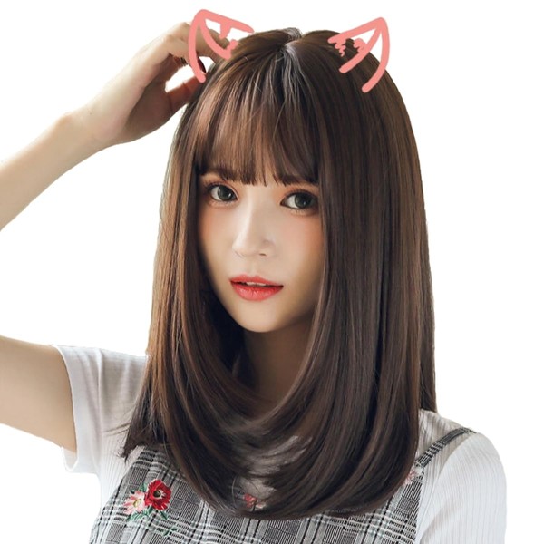 - Full Wig, Semi-Long, Medium Length, Loose and Fluffy, Straight, Button Bangs, Princess Cut, Neat Girls, Cute Net, 3 Colors