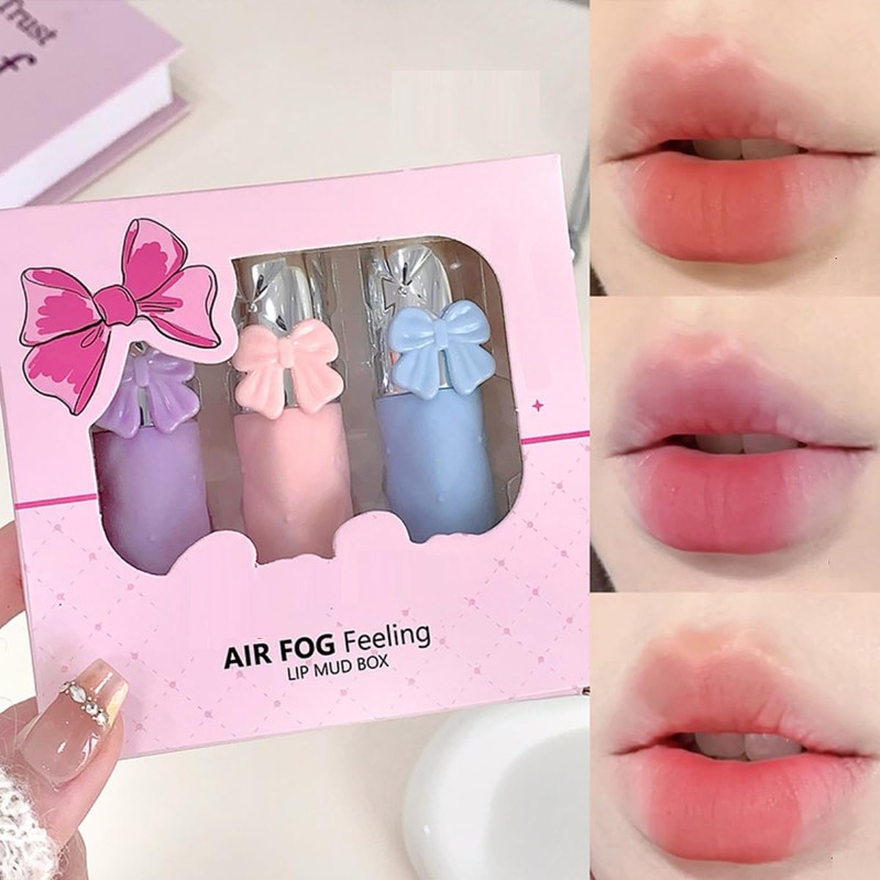 KARLOR Girls Lipstick Set, 3 Pcs Rose Lip Cream Lipsticks Lip Mud Pink Peach Coral Bow Lip Gloss Set Lip Mud Matte Long Lasting Girls Gift