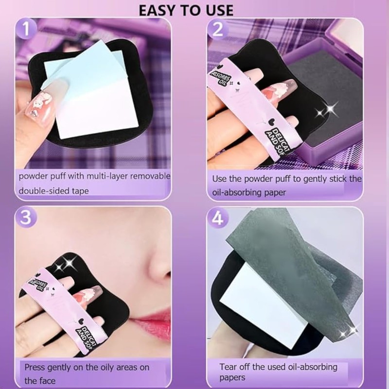 - With puff and mirror: There are several layers of adhesive tape on the back of the pouf, and you can stick oil-absorbing paper to it as desired. If the tape is no longer sticky enough, simply tear off the old tape and replace it. Oil absorbing paper with puff for quick and easy control of excess oil on the face