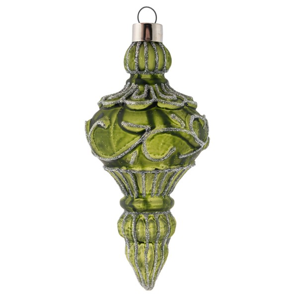 Karma, Christmas Hanging Ornament, Silver Glitter Leaf Scroll Glass Finial Ornament Sage