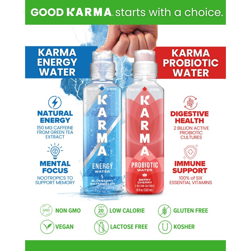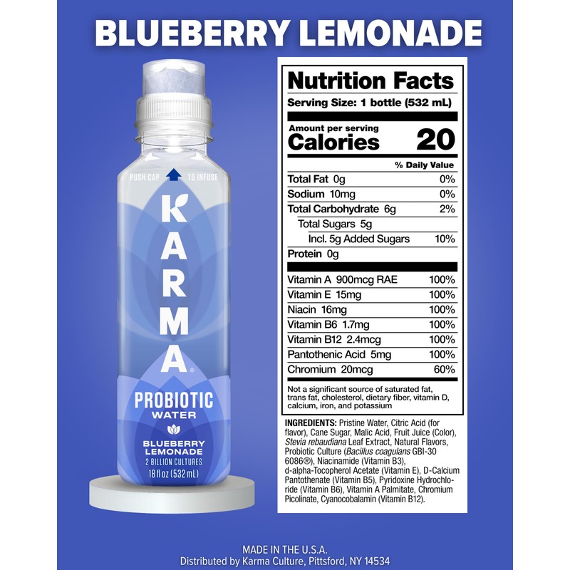 - TRANSFORM WATER INTO WELLNESS – Karma Wellness Water is an all-natural refreshment made with spring water, non-GMO, gluten-free, vegan and lactose-free ingredients; Order a 12-pack of the Blueberry-Lemonade flavor today