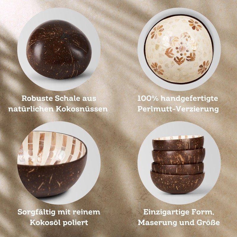 - Individual design: the bowl set presents four coordinating mother of pearl designs that form a perfect contrast to the rustic charm of the coconut shell. As all decorative bowls are handmade and a natural product, each bowl is unique with unique shape, grain and size.