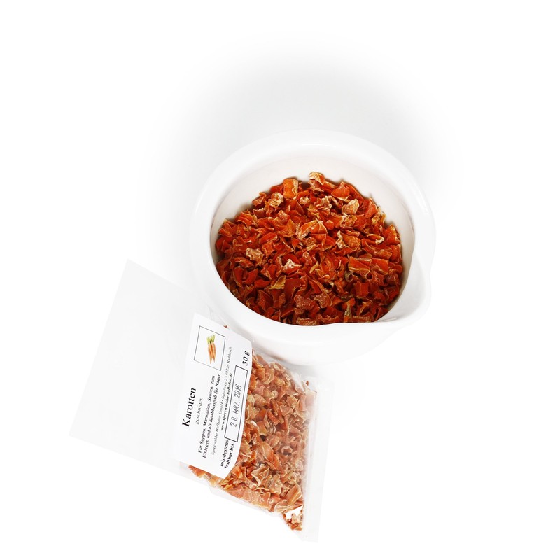 - Karotten getrocknet haben eine kräftige Farbe, die nach dem Trocknen die hohe Qualität dieses leckeren Naturproduktes anzeigt. In getrockneter Form lassen sich die Karotten bedeutend länger aufbewahren als im frischen Zustand, bei einer Lagerung im Gefrierfach ist dieses tolle Gemüse für Jahre haltbar.
