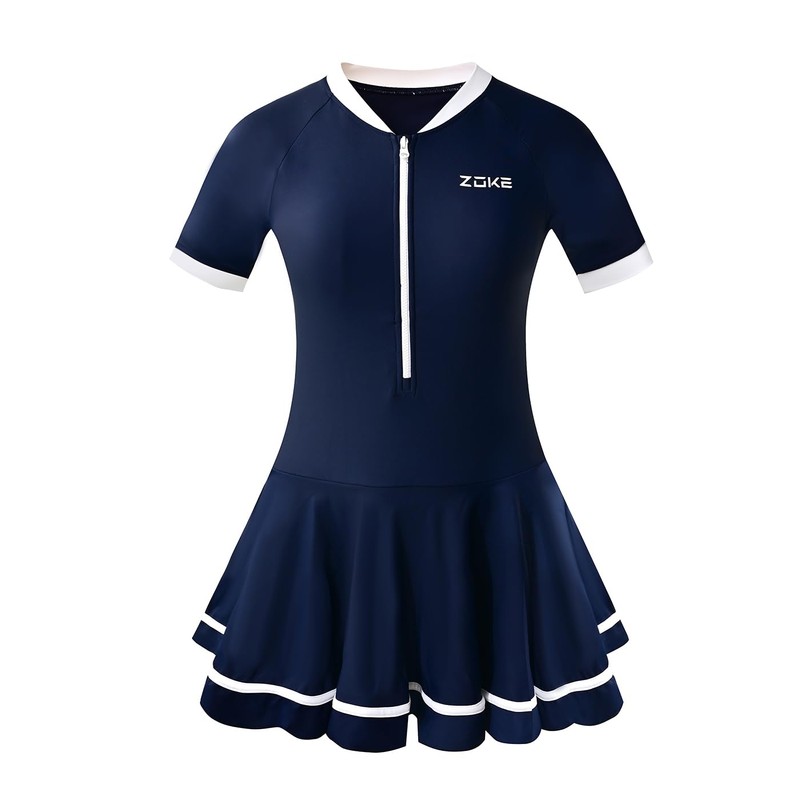 karrack Girls Swimsuit Sport Skirted Bathing Suit One Piece UPF 50+ Sun Protection Bathing Beach Zipper Swim Dress (Size 8-10Years) Deep Blue/White