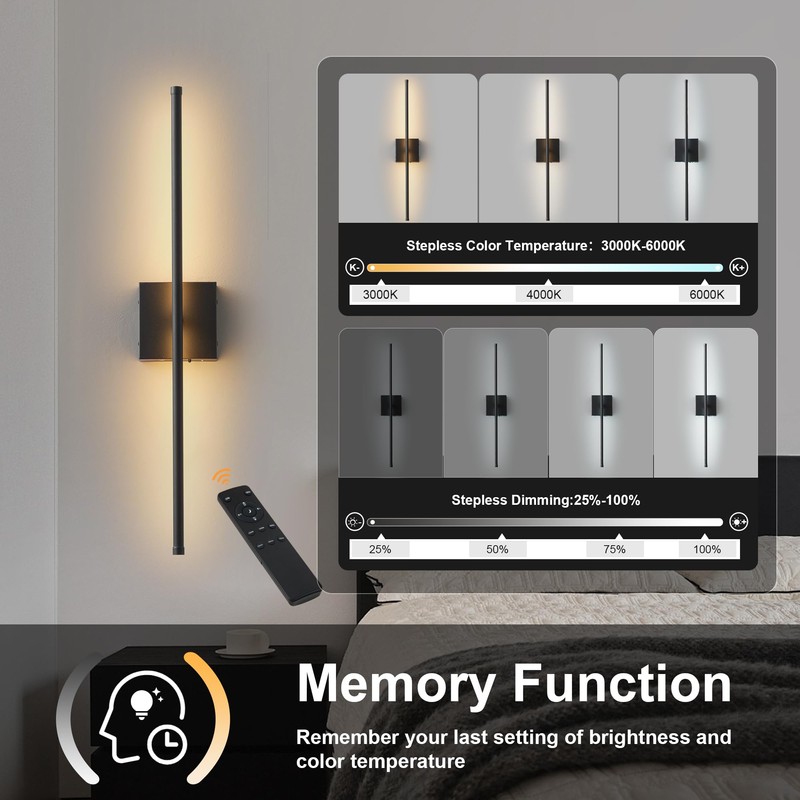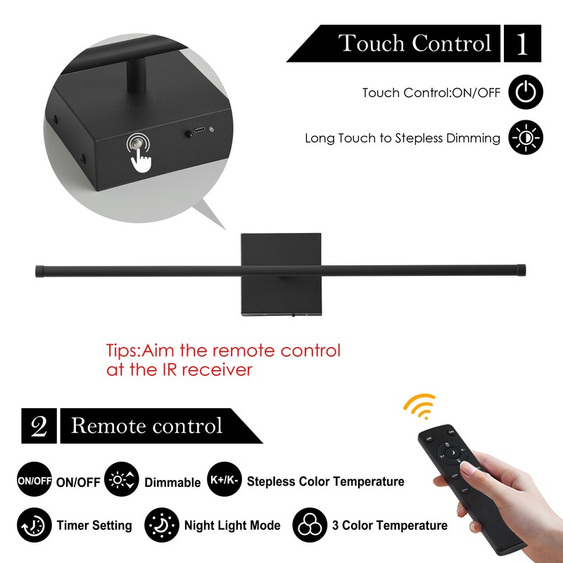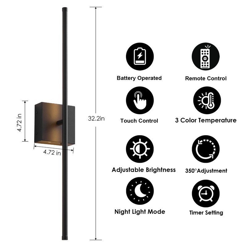 Removable Battery Operated Wall Sconces with Remote Control, Stepless Colors 3000K-6000K & Dimming, 350°Rotate, LED Black Wireless Wall Light for Living Room, Bedroom, 32.2 Inch (2 Pack)