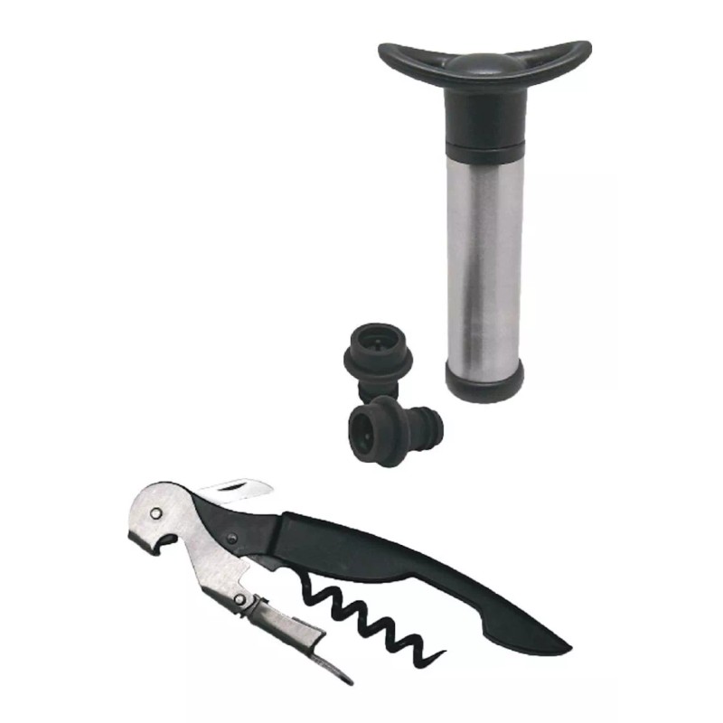 Baum Brothers Juego básico de Bar para Vino de 4 Piezas, Incluye: 1 Sacacorchos de Doble bisagra 1 Bomba de vacío 2 Tapones