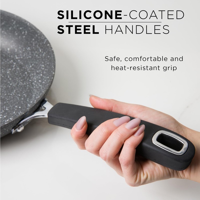 - [OVEN SAFE]: simply move your cookware from stovetop to oven, silicone-coated steel handles of this pots and pans set are heat-resistant up to 356°F.