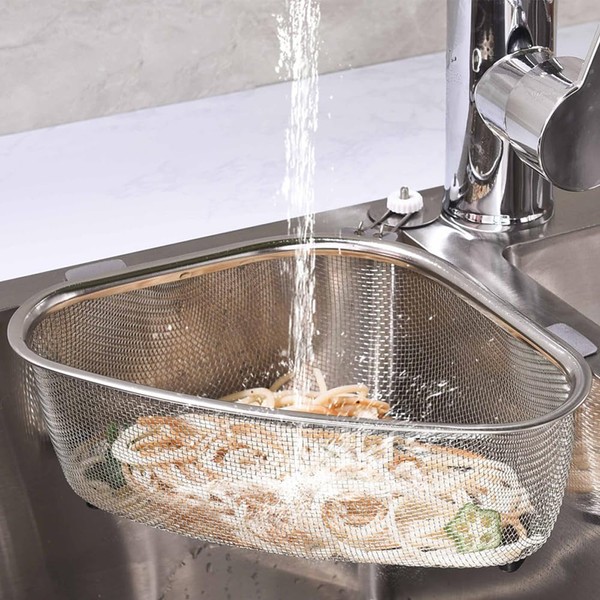 - Stainless steel triangular corner: rust resistant, easy to clean. Convenient for disposal of vegetable debris and food waste, the triangular corner is good for draining. Size: Approx. 8.7 x 5.5 x 3.1 inches (22 x 14 x 8 cm); Weight: Approx. 4.9 oz (140 g); Material: Body: Stainless steel; Legs: Synthetic rubber