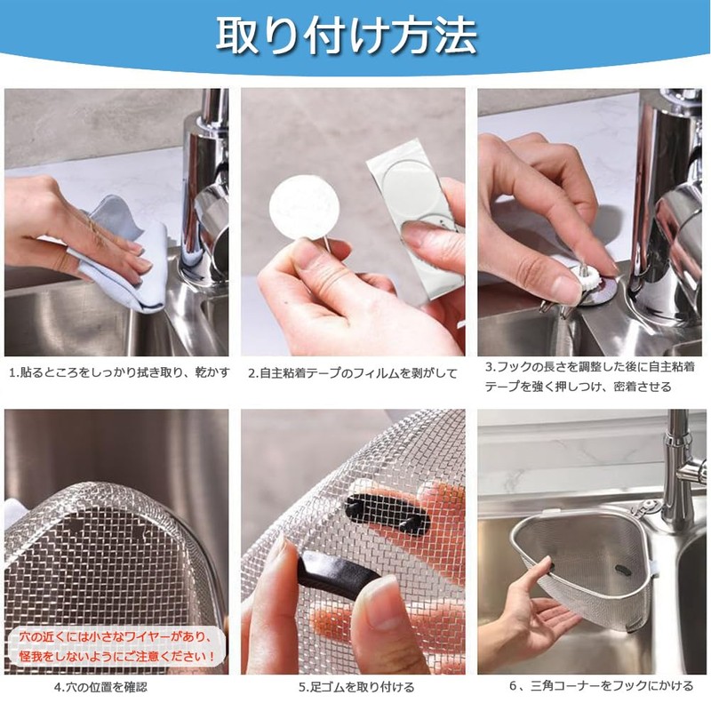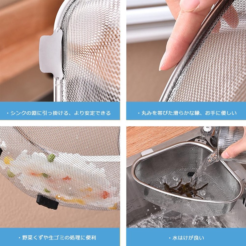 - Stainless steel triangular corner: rust resistant, easy to clean. Convenient for disposal of vegetable debris and food waste, the triangular corner is good for draining. Size: Approx. 8.7 x 5.5 x 3.1 inches (22 x 14 x 8 cm); Weight: Approx. 4.9 oz (140 g); Material: Body: Stainless steel; Legs: Synthetic rubber