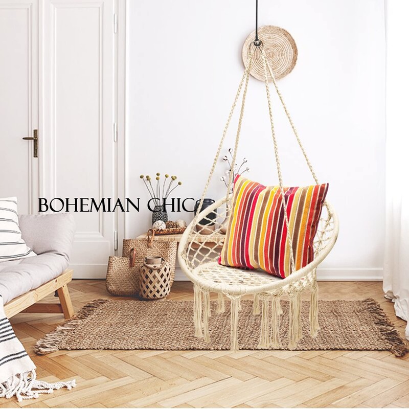 - STYLISH DESIGN: Chic interlacing pattern and elegant draping tassels, Bohemian chic macrame swing chair with two warm lights allows you to enjoy your own leisure time in your bedroom, patio, garden, yard, porch or anywhere else