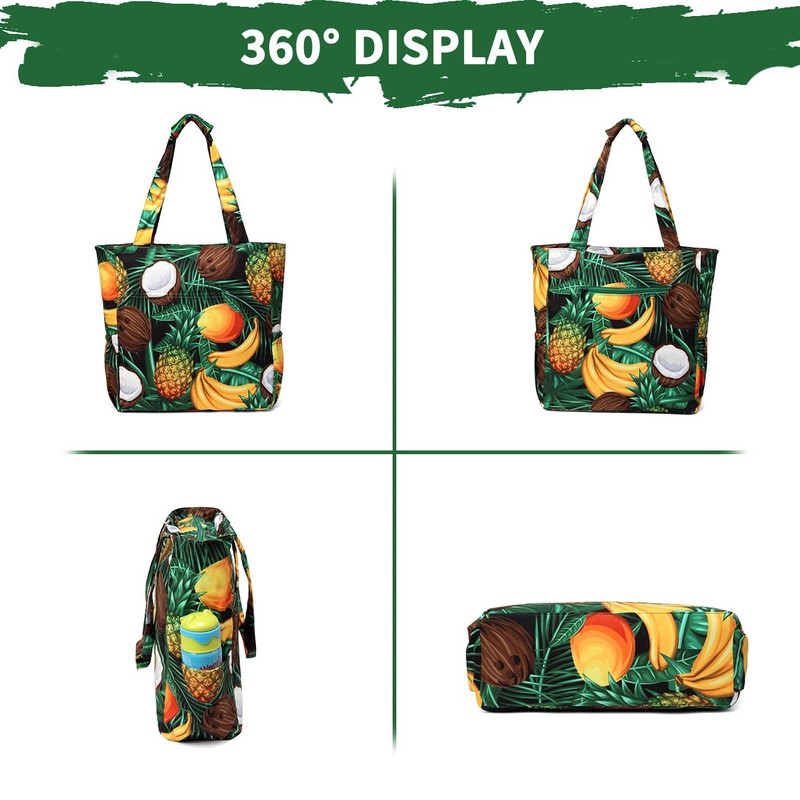 Kasqo Beach Tote Bags for Women, Waterproof Sandproof Large Pool Bag Stylish Zipper Beach Tote for Gym Travel Shopping, Tropical Fruits