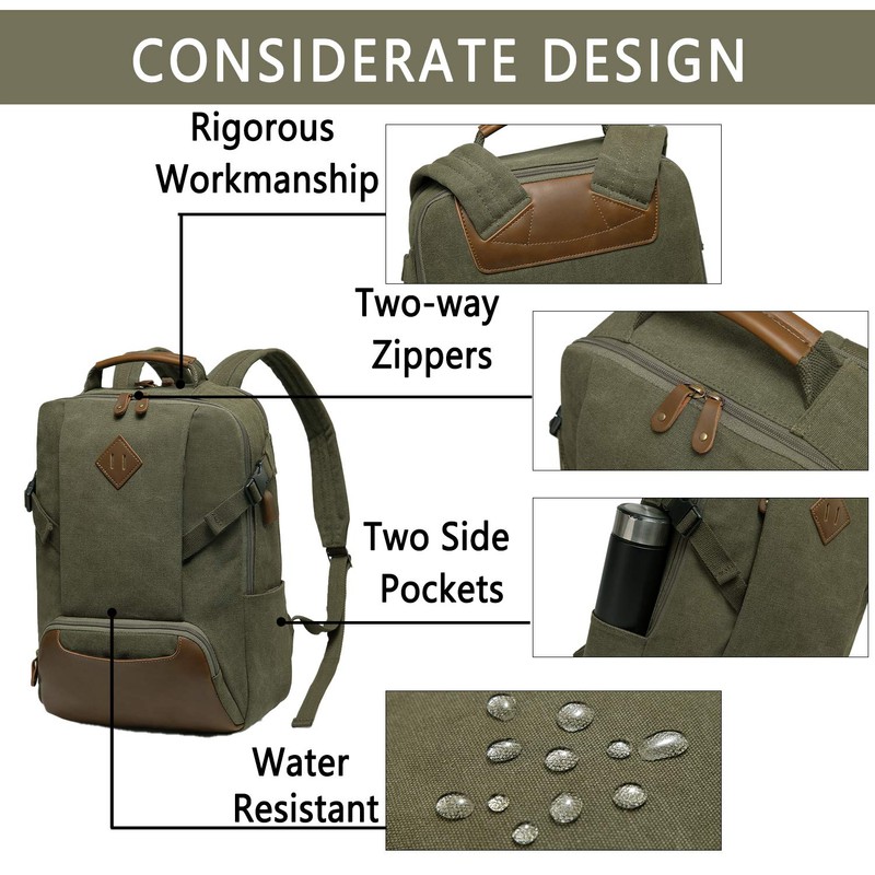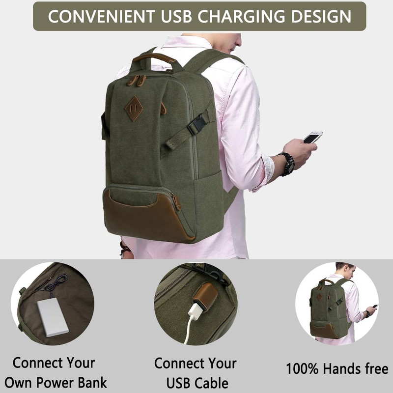 - ▲ High Quality: Perfectly combined with vintage outlook and durability, this vintage backpack functionally shows its two main large compartments with plenty of interior and exterior pockets. This Kasqo college backpack is sturdy and eco-friendly with the water-resistant canvas. Front faux leather magnetic button pocket and the adjustable side buckle strap nicely maintain its fashion. You could charge your phone through the USB charging port on-the-go.