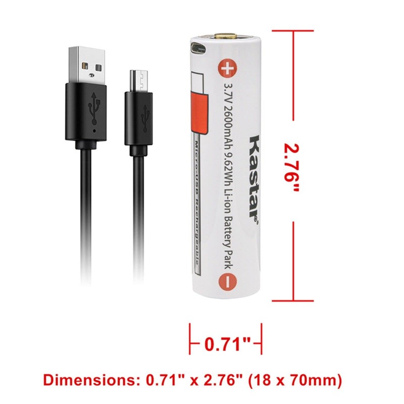 - Kastar Magic Battery can be charged w/ Micro USB with 5Volt 2A adapter. i) A USB battery: Directly provides high-speed charging from the wall and on-the-go! Convenience at your finger tips! ii) Easily know the battery status when you charging the battery with LED Lights on the battery. Battery Type: Lithium-Ion; Battery Voltage: 3.6V; Battery Capacity: 2600mAh. Battery Dimensions: 2.76" x 0.71" (70 x 18 mm)