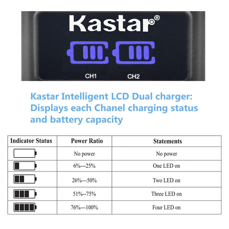 - Kastar LKD2 Dual Slot charger, can charge 2 batteries at the same time.