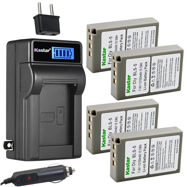 Kastar 4-Pack Battery and LCD AC Charger Compatible with Olympus BLS-5, PS-BLS5, BLS-50, Olympus E-PL10, E-PM1, E-PM2, Stylus 1, Stylus 1s, OM-D E-M10, OM-D E-M10 Mark II, OM-D E-M10 Mark III Cameras