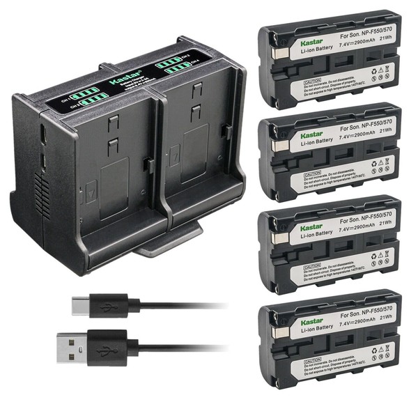 Kastar 4-Pack Battery and Quadruple Charger Compatible with Sony NP-F330 NP-F550 NP-F570 NP-F730 NP-F750 NP-F770 NP-F780Exp NP-F930 NP-F950 NP-F960 NP-F970 NP-F970Pro NP-F980Exp NP-F990 NP-F990Exp