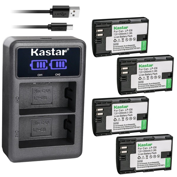 Kastar 4-Pack LP-E6 Battery and LED2 USB Charger Compatible with Canon LP-E6, LP-E6N, LP-E6NH Battery, LC-E6, LC-E6E Charger, BG-E6, BG-E9, BG-E11, BG-E13, BG-E14, BG-E16, BG-E20, BG-E21, BG-E22 Grip