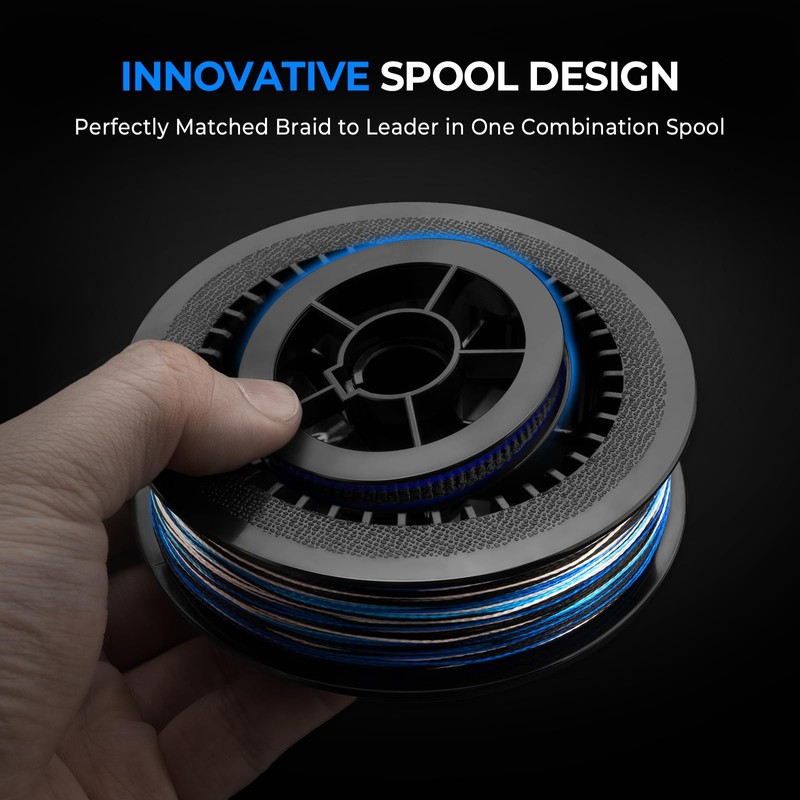 - INNOVATIVE SPOOL DESIGN HOUSES MAINLINE AND LEADER – Housed in one convenient spool within a spool design, Destron Complete 4X braided fishing line matched with a proven performer TriPolymer Advanced Monofilament leader takes the guesswork out of which leader to use with your mainline. The outside spool contains the braided mainline and the inner spool contains the leader spool. Once the mainline is placed onto your reel, you can merely unlock the smaller inner leader spool to be used as needed.