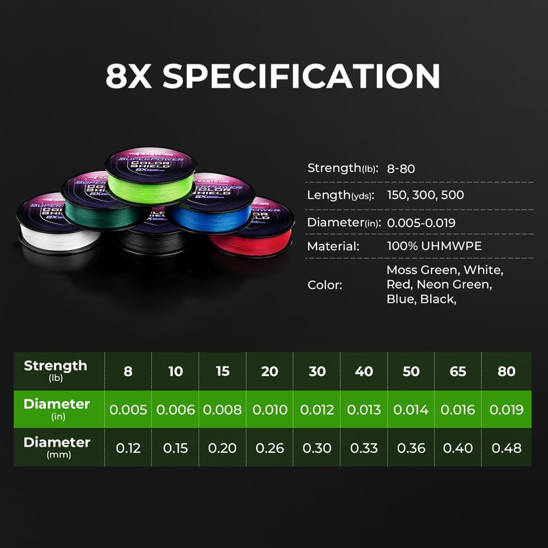 Elevate your fishing experience with the KastKing SuperPower ColorShield 8X Braided Fishing Line—the ultimate choice for anglers seeking unmatched performance and reliability.Engineered with solution-dyed UHMWPE fibers, this line is completely colorfast, retaining its vibrant hue even after prolonged exposure to sunlight, water, and harsh fishing conditions.With eight tightly woven strands, this line features an ultra-smooth, round profile that minimizes friction, ensuring quieter operation, longer casting distances, and effortless retrieval.Near-zero stretch enhances sensitivity, allowing anglers to detect even the faintest bites and changes in bottom structure for improved hook-setting and greater fishing success.Designed to withstand high tension and pressure, this line delivers exceptional knot strength, ensuring secure connections for intense fish fights—allowing you to fish without worrying about knot failures or lost catches.Low-memory construction keeps this line supple and tangle-free, enabling more natural lure presentations and better control.Whether fishing in freshwater or saltwater, the KastKing SuperPower ColorShield 8X Braided Fishing Line provides the durability, performance, and reliability needed to take your fishing game to the next level.