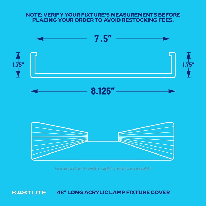 - EASY INSTALLATION: Replace your lens in no time with KastLite DSB48 2-Lamp Plastic Ceiling Light Cover. This tool-free snap-on 8" wide fluorescent light diffuser is ideal for replacing covers in your garage or workshop.