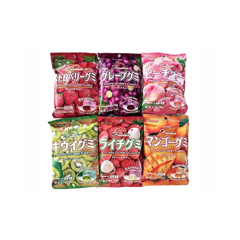 - VARIETY PACK: Set of 6 authentic Japanese gummy candy flavors including Strawberry, Grape, Peach, Kiwi, Lychee, and Mango in individual packs