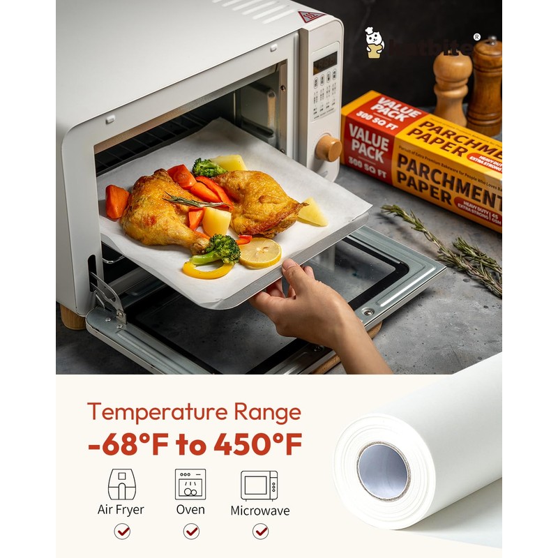 - MULTI-USE & OVEN SAFE- Do you think parchment paper for cooking is only used for food baking? NO! Because Katbite high heat parchment paper temperature resistance is from -68° F to 425° F, you can find it everywhere in kitchen whether in heat press, cake pan liners, freezer, microwave, oven baking, grilling or air fryer as long as you can think of it. Cooking papers can be used for baking cakes, cookies, breads, meat, desserts.,etc.