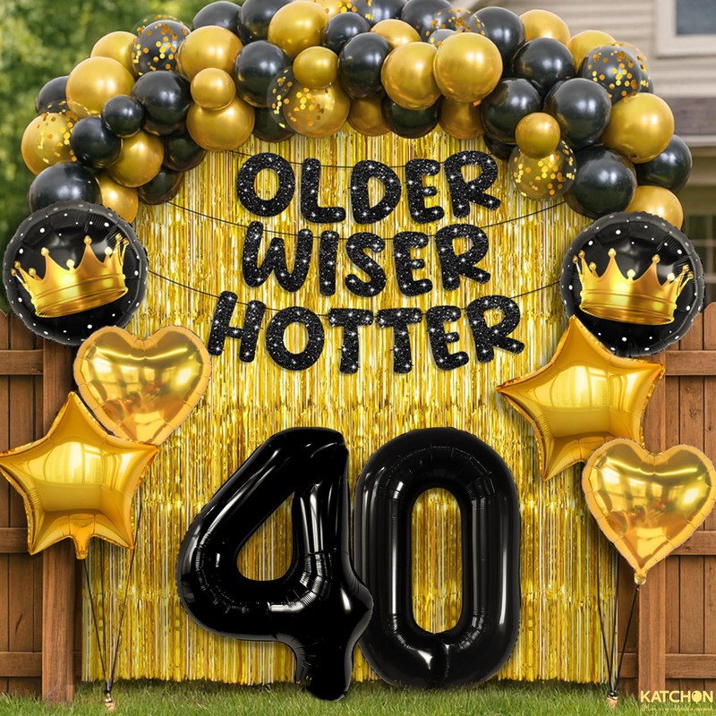KatchOn, Happy Birthday Decorations Set - Pack of 50 | Older Wiser Hotter Banner, Latex Balloons Arch Kit, Gold Foil Fringe, Star, Round, Heart Foil Balloons | 40th Birthday Decorations for Women, Men