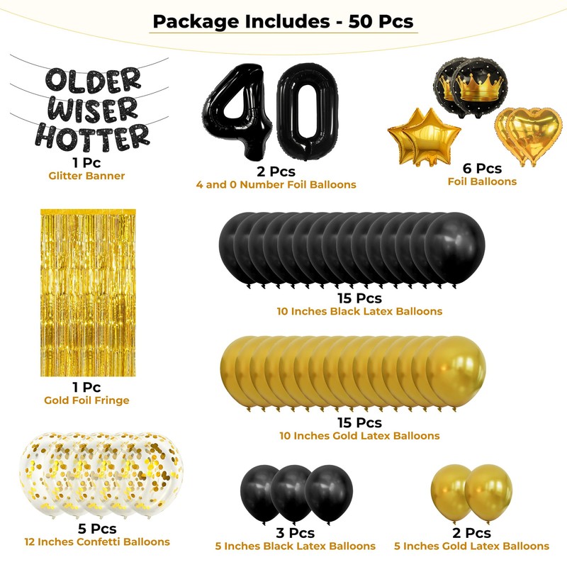 This versatile black and gold balloon arch kit includes everything you need: 15 black balloons (10 inch), 15 gold balloons (10 inch), 5 gold confetti balloons (12 inch), 3 black balloons (5 inch), 2 gold balloons (5 inch), 2 number foil balloons (40balloon numbers – 32 inch), 2 star balloons (18 inch), 2 gold heart balloons (18 inch), 2 black round balloons with gold crown print (18 inch), 1 gold foil fringe (78 inch × 39 inch), and 1 glitter “OLDER WISER HOTTER” happy 40th birthday banner.