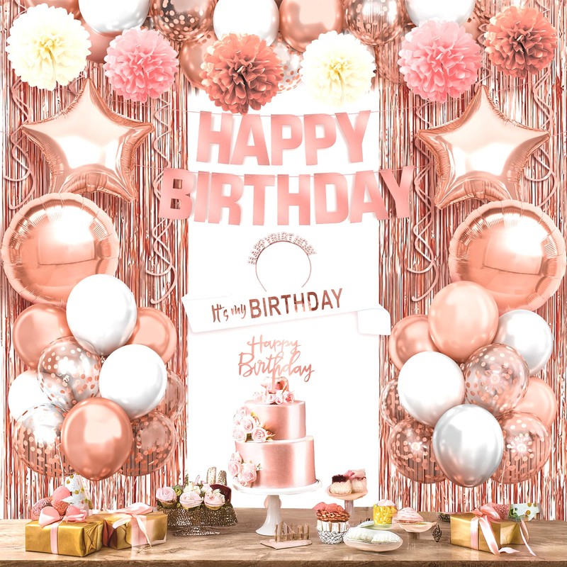 - PACK OF 47 | ALL IN ONE ROSE GOLD BIRTHDAY DECORATIONS SET : Be it indoor/outdoor happy birthday decorations for women, this large rose gold balloons birthday decoration set with rose gold happy birthday banner rose gold, white and confetti latex balloons, pompoms, rose gold fringe, happy birthday cake topper, sash and headband. All that you need to decorate your rose gold birthday decorations for women, This includes latex Balloons, birthday banner, pompoms and rose gold fringe curtain decorations.