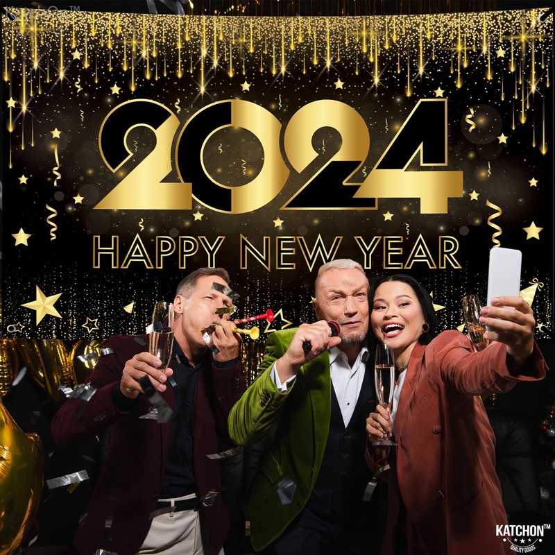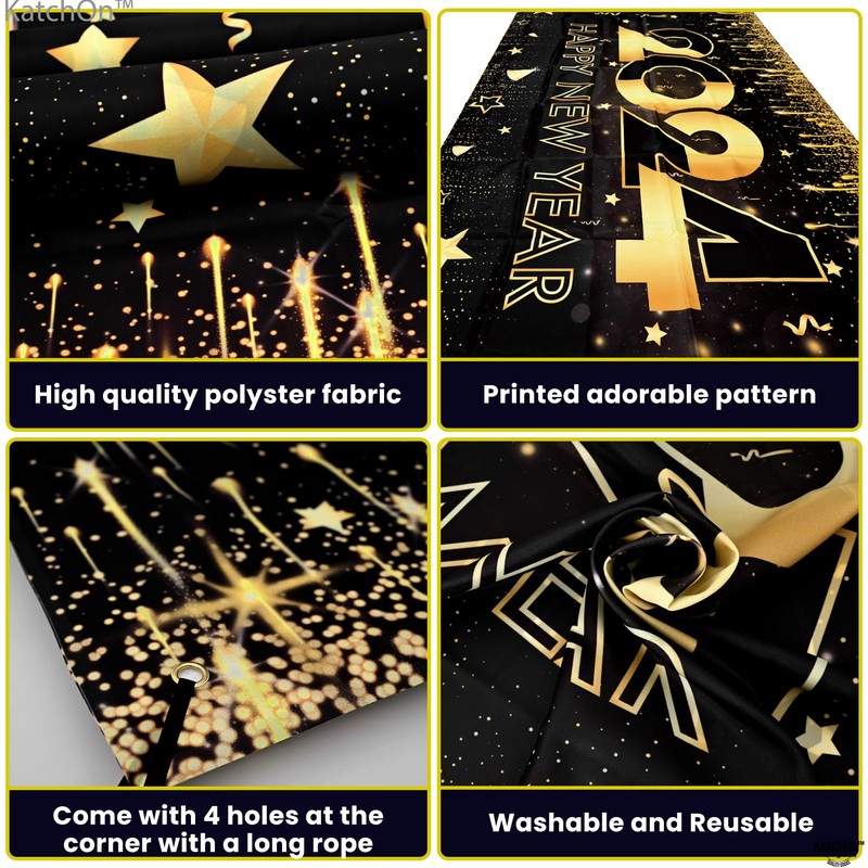 - STUNNING 2024 NEW YEAR BANNER FOR FESTIVE DECORATIONS : Light up your new years eve decorations 2024 with this luxurious and perfect color match black and gold new year banners. Click numerous pictures with this glamorous happy new year backdrop for photography. This happy new years banner 2024 is a perfect 2024 decorations new years. Make your 2024 happy new year decorations memorable and fun with our new years eve kids party supplies.