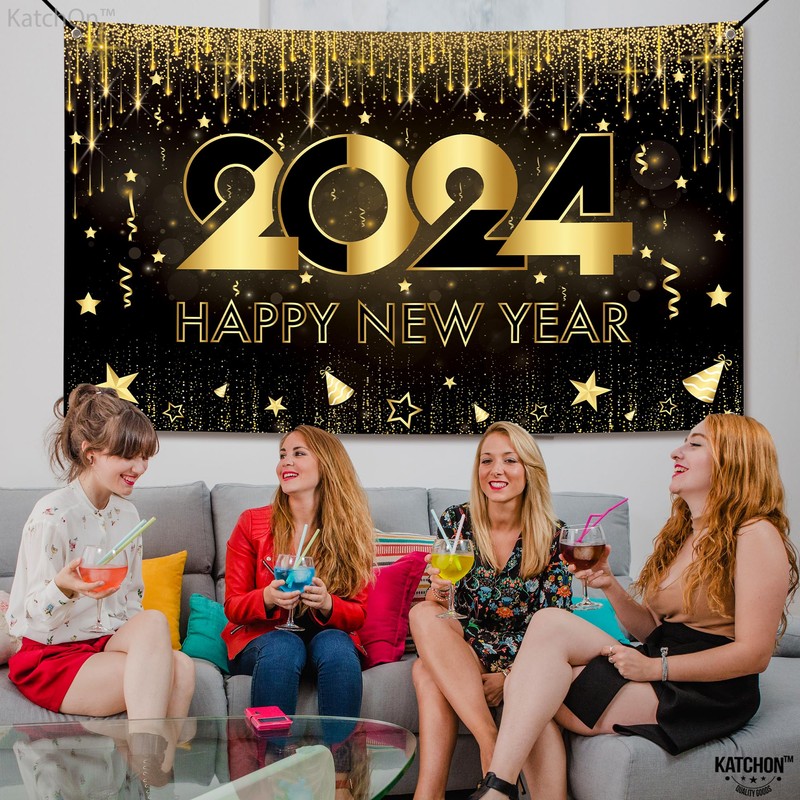 - XTRA LARGE 72x44 INCH HAPPY NEW YEAR 2024 BANNER : Make way for 2024!! This beautiful black and gold shiny and sparkling 2024 new years banner will be center of everyones attention. This Extra Large 72x44 Inch Happy New Year 2024 Banner is a perfect choice to add charm to your new year's eve decorations 2024. This black and gold new years eve party banner 2024 will create an extravaganza party vibe which will astound your guests and will make your new year eve party memorable.